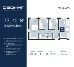 3-комн. квартира от застройщика в ЖК "Беринг" на 11 этаже. Квартира без отделки, после оформления собственности можно делать ремонт. Общая площадь: 73.45 кв.м., жилая: 34.76 кв.м., площадь просторной кухни-столовой: 19.04 кв.м. Угловая квартира, идеально подойдет любителям тишины и панорамных видов. В квартире одна лоджия, один совмещенный и один раздельный санузел. Высота потолков 2.75 м.
