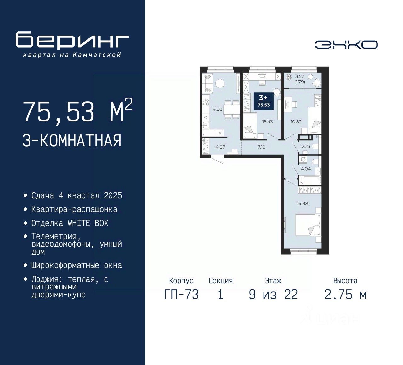 3-комн. квартира от застройщика в ЖК "Беринг" на 9 этаже. Квартира без отделки, новый собственник может сделать ремонт по своему проекту. Общая площадь: 75.53 кв.м., жилая: 41.23 кв.м., площадь просторной кухни-столовой: 14.98 кв.м. Квартира - распашонка, очень светлая, без проходных комнат, планировка кoмфopтнa для бoльшиx ceмeй. В квартире одна лоджия, один совмещенный и один раздельный санузел. Высота потолков 2.75 м.