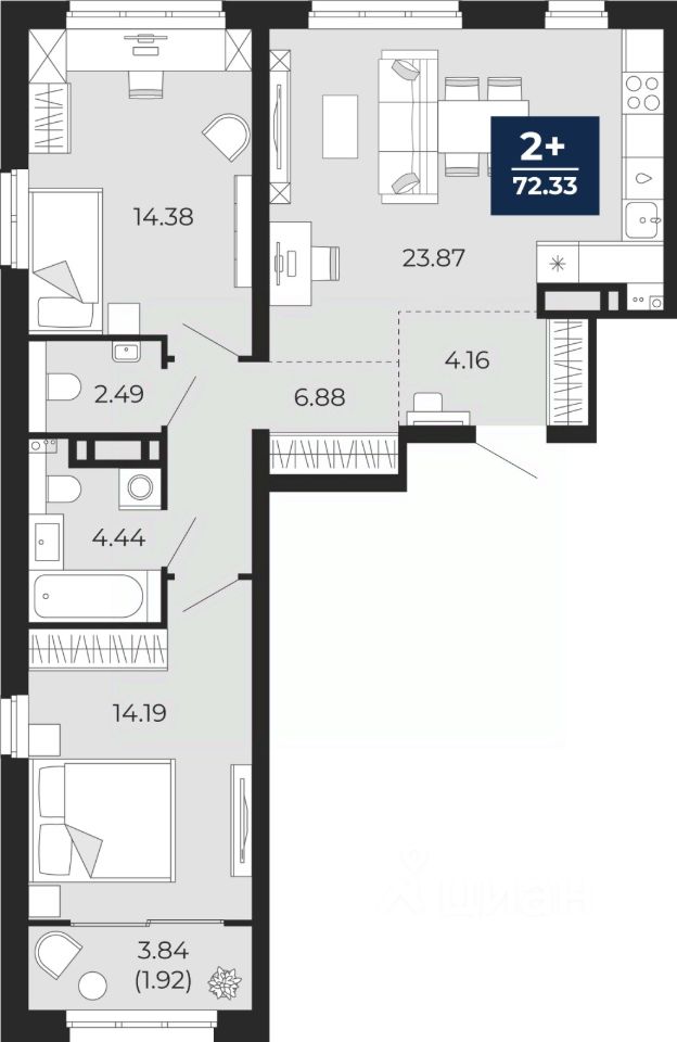 Просторная 2-комн. квартира в ЖК "Беринг" на 21 этаже. Квартира без отделки, после оформления собственности можно делать ремонт. Общая площадь: 72.33 кв.м., жилая: 28.57 кв.м., площадь просторной кухни-столовой: 23.87 кв.м. Квартира - распашонка, без проходных комнат, окна выходят на paзные стороны дома. В квартире один балкон, один совмещенный и один раздельный санузел. Высота потолков 2.75 м.
