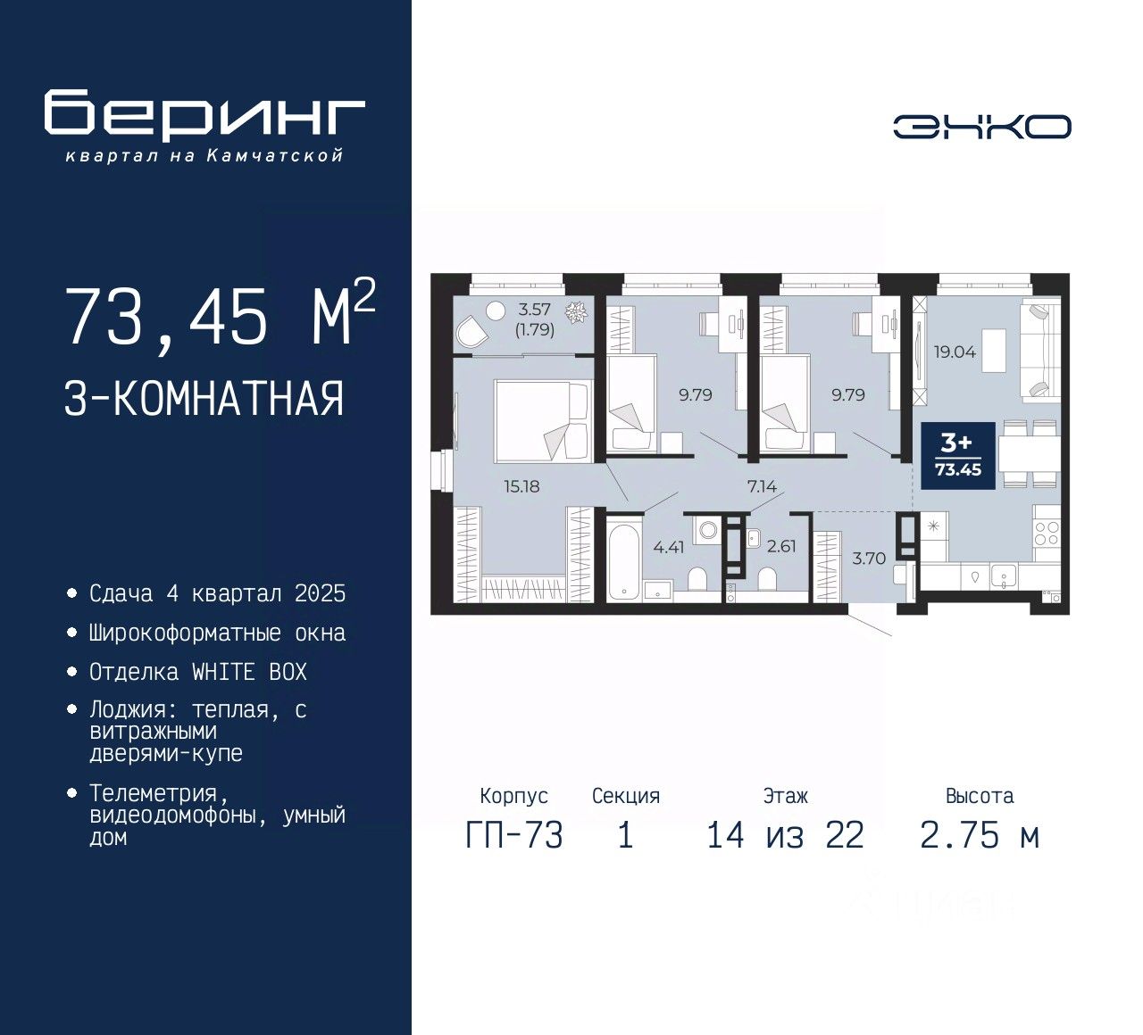 3-комн. квартира в ЖК "Беринг" на 14 этаже. Квартира без отделки, полностью готова к ремонту. Общая площадь: 73.45 кв.м., жилая: 34.76 кв.м., площадь просторной кухни-столовой: 19.04 кв.м. Квартира угловая, идеально подойдет любителям тишины и панорамных видов. В квартире одна лоджия, один совмещенный и один раздельный санузел. Высота потолков 2.75 м.