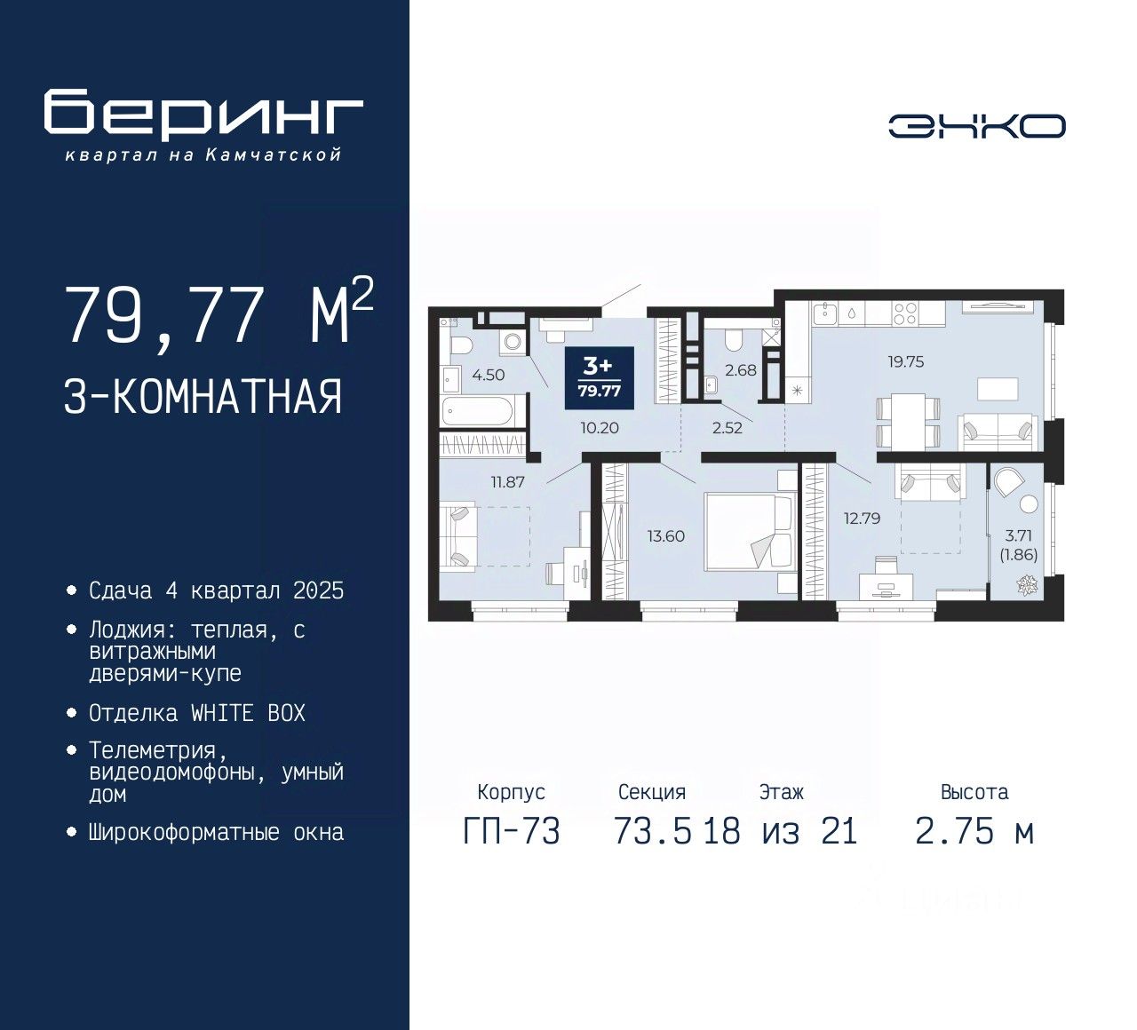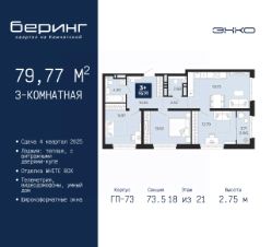 3-комн. квартира от застройщика в ЖК "Беринг" на 18 этаже. Квартира без отделки, после выдачи ключей можно делать ремонт. Общая площадь: 79.77 кв.м., жилая: 38.26 кв.м., площадь просторной кухни-столовой: 19.75 кв.м. Квартира угловая, идеально подойдет любителям тишины и панорамных видов. В квартире одна лоджия, один совмещенный и один раздельный санузел. Высота потолков 2.75 м.