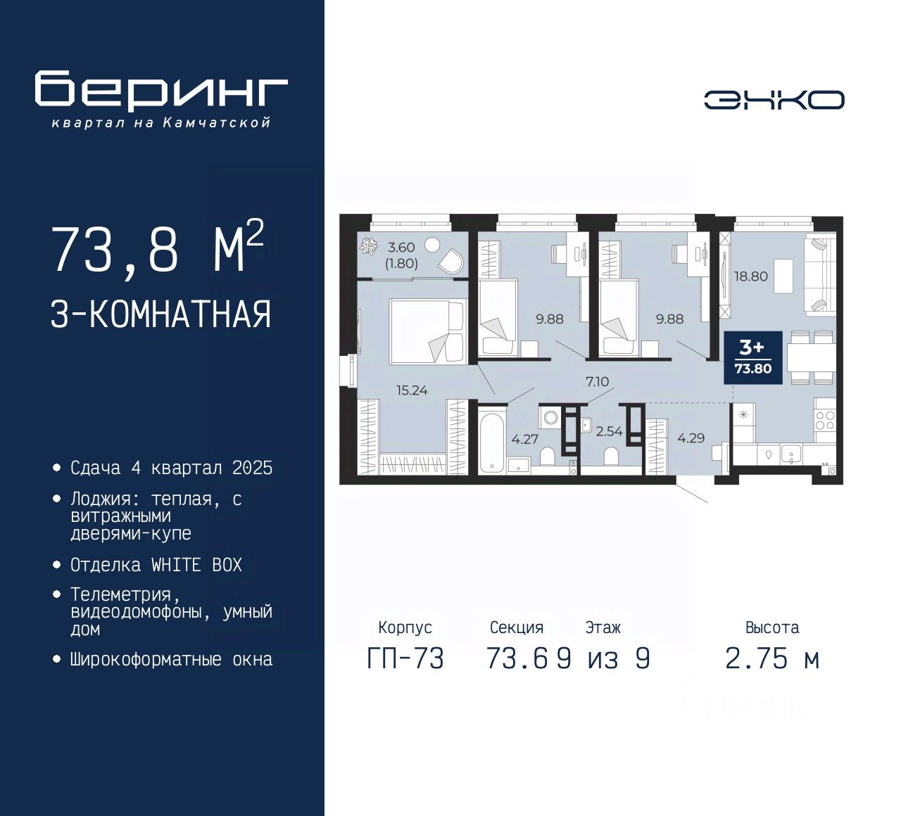 3-комн. квартира от застройщика в ЖК "Беринг" на 9 этаже. Квартира без отделки, после выдачи ключей можно делать ремонт. Общая площадь: 73.8 кв.м., жилая: 35 кв.м., площадь просторной кухни-столовой: 18.8 кв.м. Угловая квартира, идеально подойдет любителям тишины и панорамных видов. В квартире одна лоджия, один совмещенный и один раздельный санузел. Высота потолков 2.75 м.