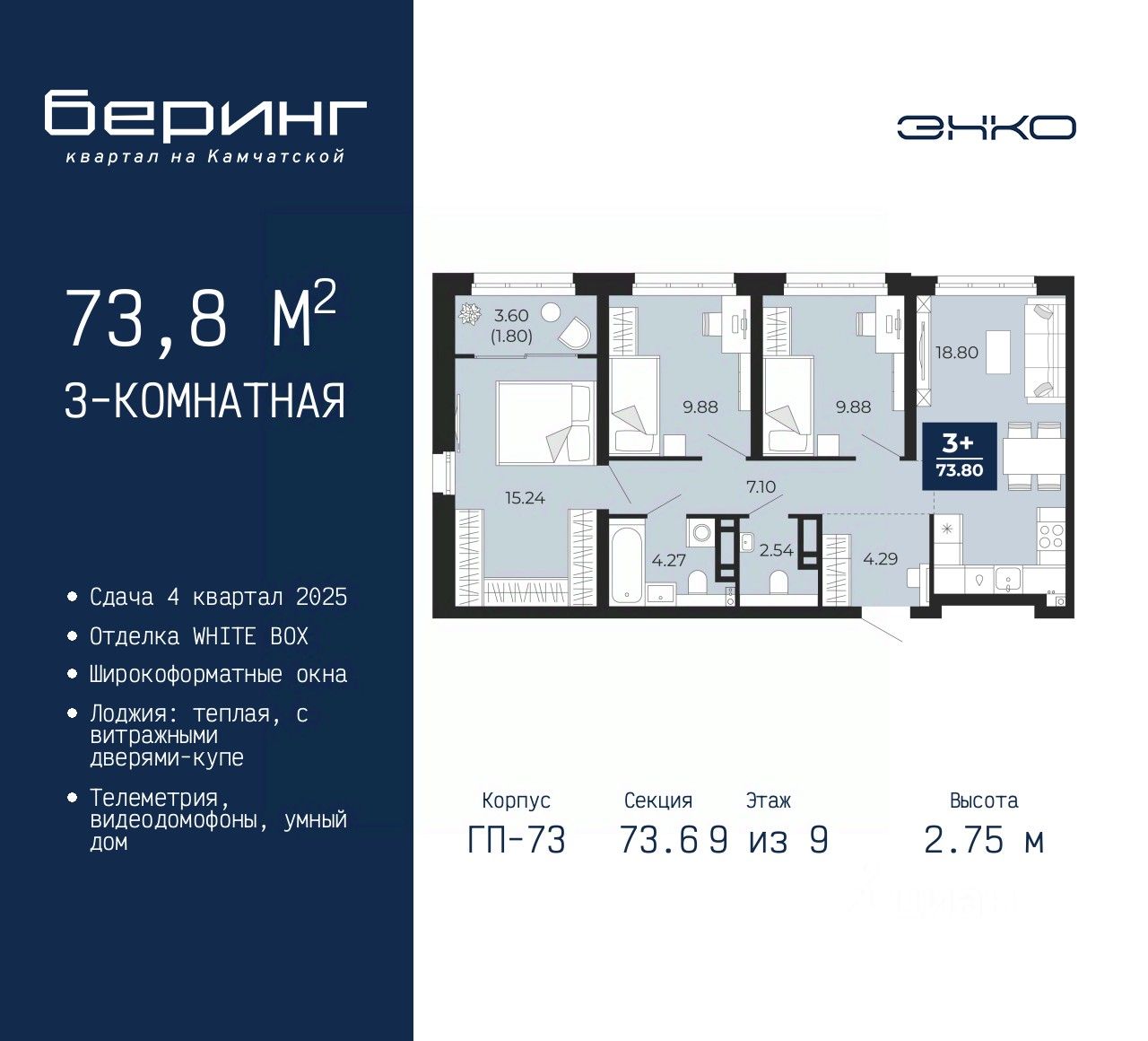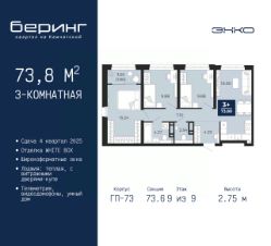 Трехкомнатная квартира от застройщика в ЖК "Беринг" на 9 этаже. Квартира без отделки, полностью готова к ремонту. Общая площадь: 73.8 кв.м., жилая: 35 кв.м., площадь просторной кухни-столовой: 18.8 кв.м. Угловая квартира, идеально подойдет любителям тишины и панорамных видов. В квартире одна лоджия, один совмещенный и один раздельный санузел. Высота потолков 2.75 м.