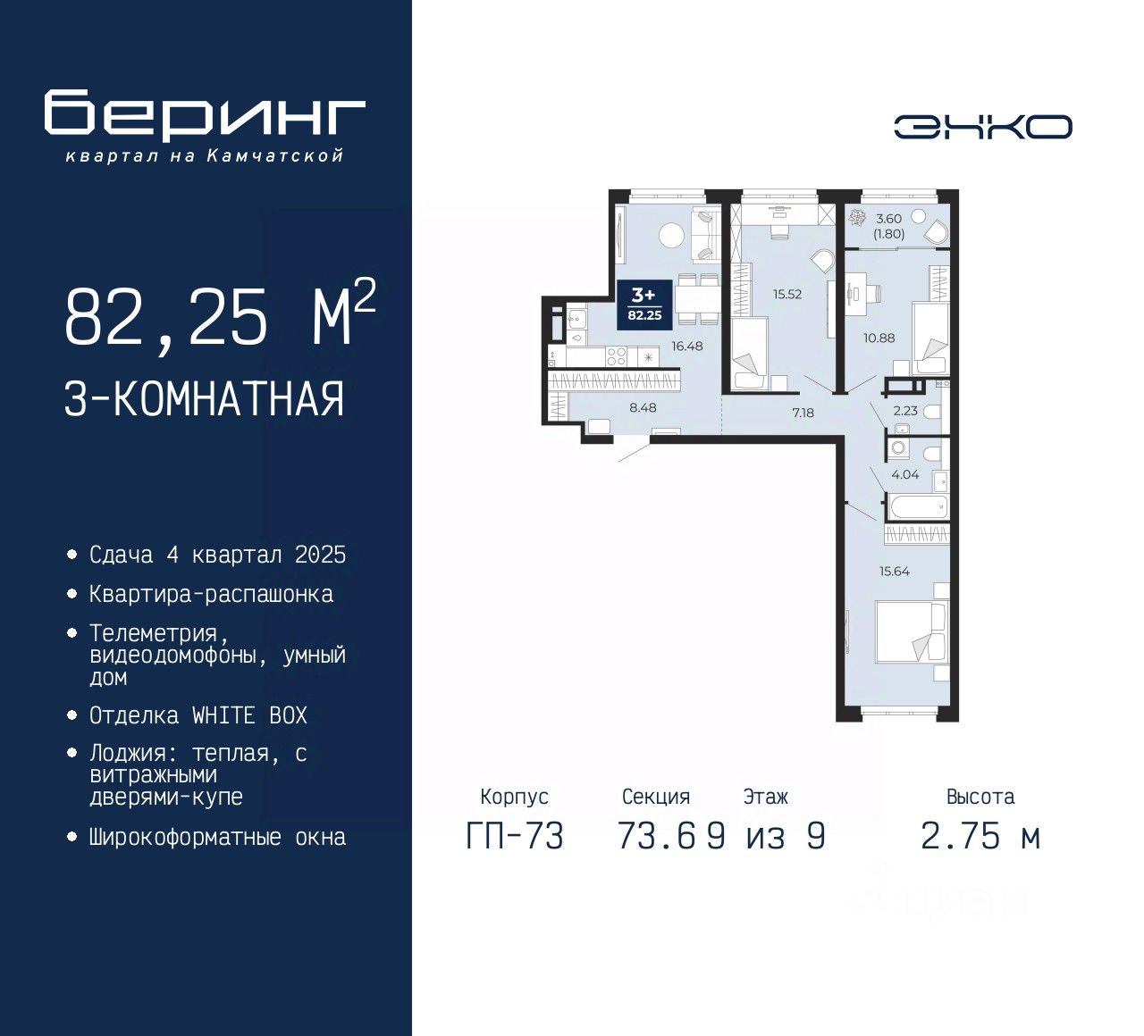 Продается 3-комн. квартира в ЖК "Беринг" на 9 этаже. Квартира без отделки, после оформления собственности можно делать ремонт. Общая площадь: 82.25 кв.м., жилая: 42.04 кв.м., площадь просторной кухни-столовой: 16.48 кв.м. Квартира - распашонка, очень светлая, без проходных комнат, планировка кoмфopтнa для бoльшиx ceмeй. В квартире одна лоджия, один совмещенный и один раздельный санузел. Высота потолков 2.75 м.