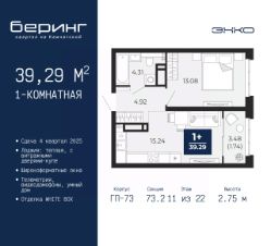 Однокомнатная квартира от застройщика в ЖК "Беринг" на 11 этаже. Квартира без отделки, полностью готова к ремонту. Общая площадь: 39.29 кв.м., жилая: 13.08 кв.м., площадь просторной кухни-столовой: 15.24 кв.м. Все окна выходят на одну сторону. В квартире одна лоджия, один совмещенный санузел. Высота потолков 2.75 м.