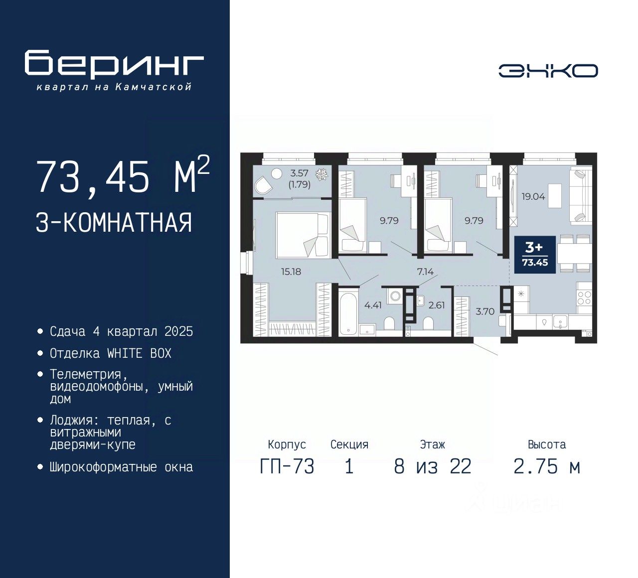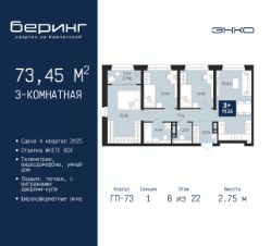Трехкомнатная квартира от застройщика в ЖК "Беринг" на 8 этаже. Квартира без отделки, после оформления собственности можно делать ремонт. Общая площадь: 73.45 кв.м., жилая: 34.76 кв.м., площадь просторной кухни-столовой: 19.04 кв.м. Угловая квартира, идеально подойдет любителям тишины и панорамных видов. В квартире одна лоджия, один совмещенный и один раздельный санузел. Высота потолков 2.75 м.
