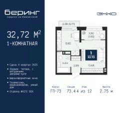 Однокомнатная квартира от застройщика в ЖК "Беринг" на 4 этаже. Квартира без отделки, после выдачи ключей можно делать ремонт. Общая площадь: 32.72 кв.м., жилая: 13.68 кв.м., площадь кухни: 8.85 кв.м. Все окна выходят на одну сторону. В квартире один балкон и одна лоджия, один совмещенный санузел. Высота потолков 2.75 м.