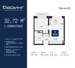 Продается 1-комн. квартира от застройщика в ЖК "Беринг" на 11 этаже. Квартира без отделки, полностью готова к ремонту. Общая площадь: 32.72 кв.м., жилая: 13.68 кв.м., площадь кухни: 8.85 кв.м. Все окна выходят на одну сторону. В квартире один балкон и одна лоджия, один совмещенный санузел. Высота потолков 2.75 м.