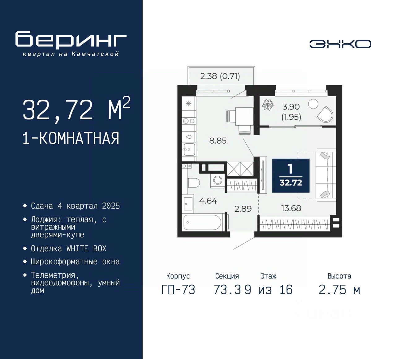 Продается 1-комн. квартира в ЖК "Беринг" на 9 этаже. Квартира без отделки, полностью готова к чистовой отделке и дальнейшему ремонту. Общая площадь: 32.72 кв.м., жилая: 13.68 кв.м., площадь кухни: 8.85 кв.м. Все окна выходят на одну сторону. В квартире один балкон и одна лоджия, один совмещенный санузел. Высота потолков 2.75 м.