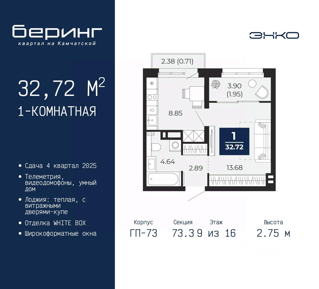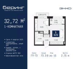 Продается 1-комн. квартира от застройщика в ЖК "Беринг" на 9 этаже. Квартира без отделки, после получения ключей можно делать ремонт. Общая площадь: 32.72 кв.м., жилая: 13.68 кв.м., площадь кухни: 8.85 кв.м. Все окна выходят на одну сторону. В квартире один балкон и одна лоджия, один совмещенный санузел. Высота потолков 2.75 м.