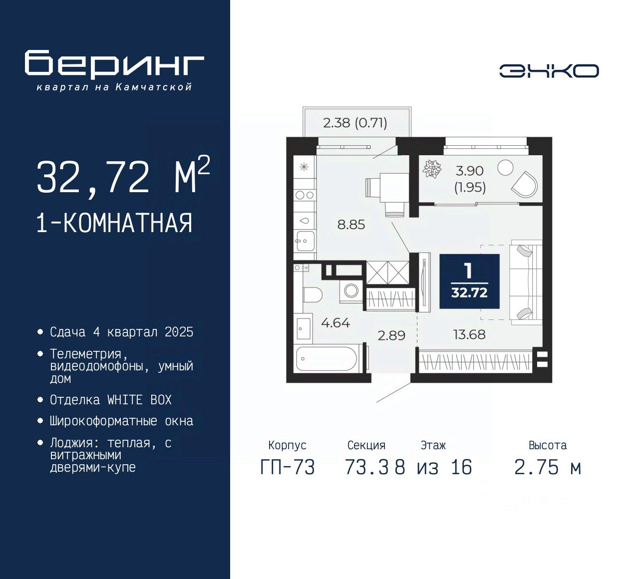 1-комн. квартира в ЖК "Беринг" на 8 этаже. Квартира без отделки, новый собственник может сделать ремонт по индивидуальному проекту. Общая площадь: 32.72 кв.м., жилая: 13.68 кв.м., площадь кухни: 8.85 кв.м. Все окна выходят на одну сторону. В квартире один балкон и одна лоджия, один совмещенный санузел. Высота потолков 2.75 м.