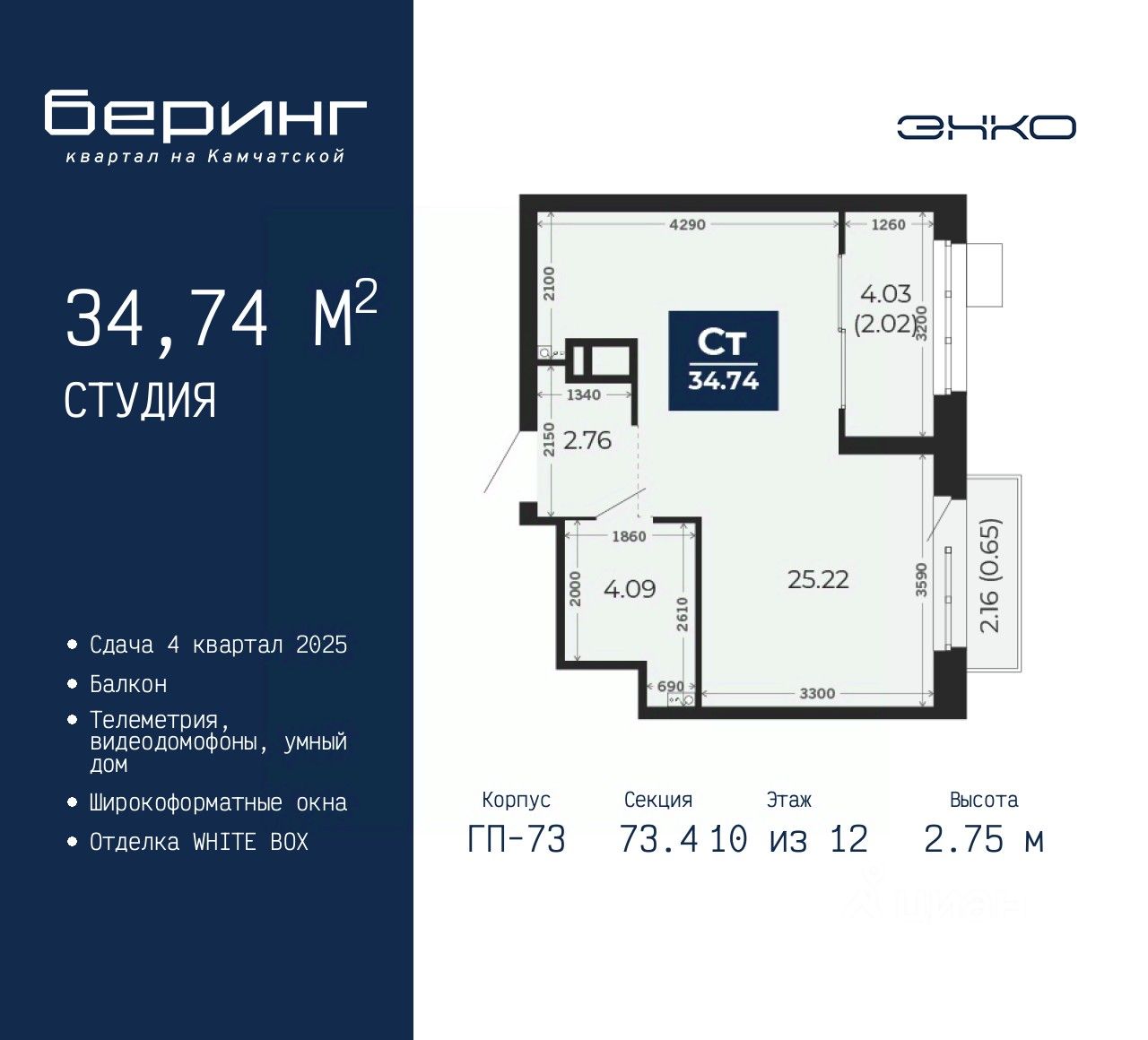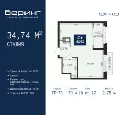 Продается 1-комн. квартира-студия от застройщика в ЖК "Беринг" на 10 этаже. Квартира без отделки, новый собственник может сделать ремонт по индивидуальному дизайн-проекту. Общая площадь: 34.74 кв.м., площадь гостиной 25.22 кв.м., из которых 5 кв.м. выделено под кухонную зону. Все окна выходят на одну сторону. В квартире один балкон, один совмещенный санузел. Высота потолков 2.75 м.
