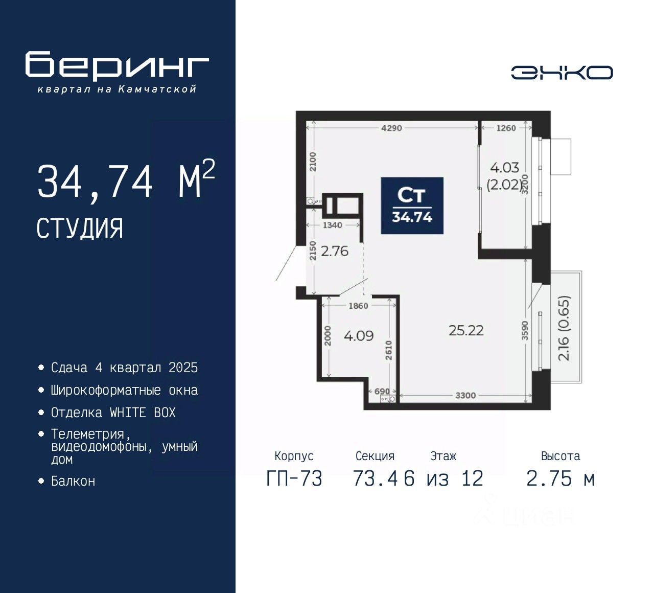 1-комн. квартира-студия от застройщика в ЖК "Беринг" на 6 этаже. Квартира без отделки, новый владелец может сделать ремонт по индивидуальному дизайн-проекту. Общая площадь: 34.74 кв.м., площадь гостиной 25.22 кв.м., из которых 5 кв.м. выделено под кухонную зону. Все окна выходят на одну сторону. В квартире один балкон, один совмещенный санузел. Высота потолков 2.75 м.