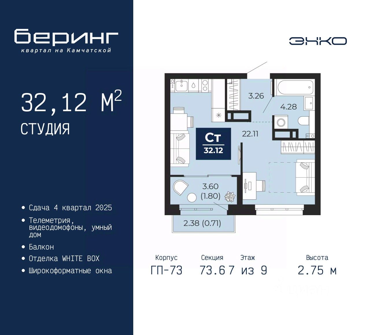 Продается 1-комн. квартира-студия от застройщика в ЖК "Беринг" на 7 этаже. Квартира без отделки, после оформления собственности можно делать ремонт. Общая площадь: 32.12 кв.м., площадь гостиной 22.11 кв.м., из которых 5 кв.м. выделено под кухонную зону. Все окна выходят на одну сторону. В квартире один балкон, один совмещенный санузел. Высота потолков 2.75 м.