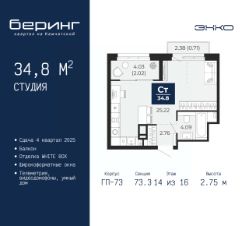 1-комн. квартира-студия в ЖК "Беринг" на 14 этаже. Квартира без отделки, новый владелец может сделать ремонт по своему дизайн-проекту. Общая площадь: 34.8 кв.м., площадь гостиной 25.22 кв.м., из которых 5 кв.м. выделено под кухонную зону. Все окна выходят на одну сторону. В квартире один балкон, один совмещенный санузел. Высота потолков 2.75 м.