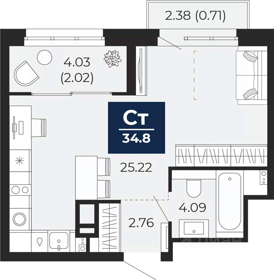 Однокомнатная квартира-студия от застройщика в ЖК "Беринг" на 15 этаже. Квартира без отделки, полностью готова к ремонту. Общая площадь: 34.8 кв.м., площадь гостиной 25.22 кв.м., из которых 5 кв.м. выделено под кухонную зону. Все окна выходят на одну сторону. В квартире один балкон, один совмещенный санузел. Высота потолков 2.75 м.