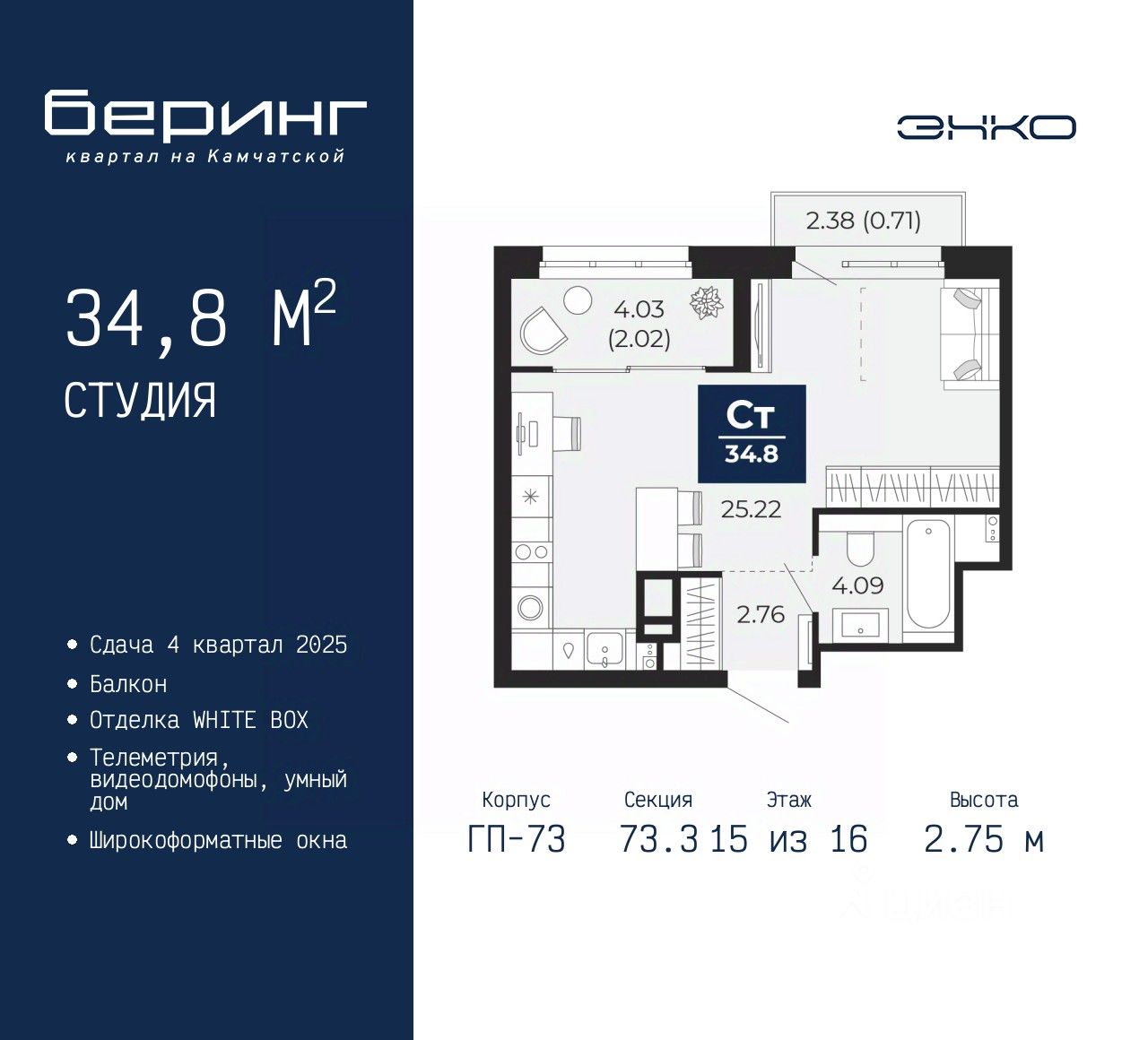 1-комн. квартира-студия от застройщика в ЖК "Беринг" на 15 этаже. Квартира без отделки, после получения ключей можно делать ремонт. Общая площадь: 34.8 кв.м., площадь гостиной 25.22 кв.м., из которых 5 кв.м. выделено под кухонную зону. Все окна выходят на одну сторону. В квартире один балкон, один совмещенный санузел. Высота потолков 2.75 м.