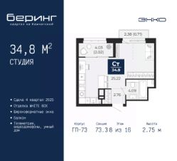 Просторная однокомнатная квартира-студия в ЖК "Беринг" на 8 этаже. Квартира без отделки, новый владелец может сделать ремонт по индивидуальному дизайн-проекту. Общая площадь: 34.8 кв.м., площадь гостиной 25.22 кв.м., из которых 5 кв.м. выделено под кухонную зону. Все окна выходят на одну сторону. В квартире один балкон, один совмещенный санузел. Высота потолков 2.75 м.