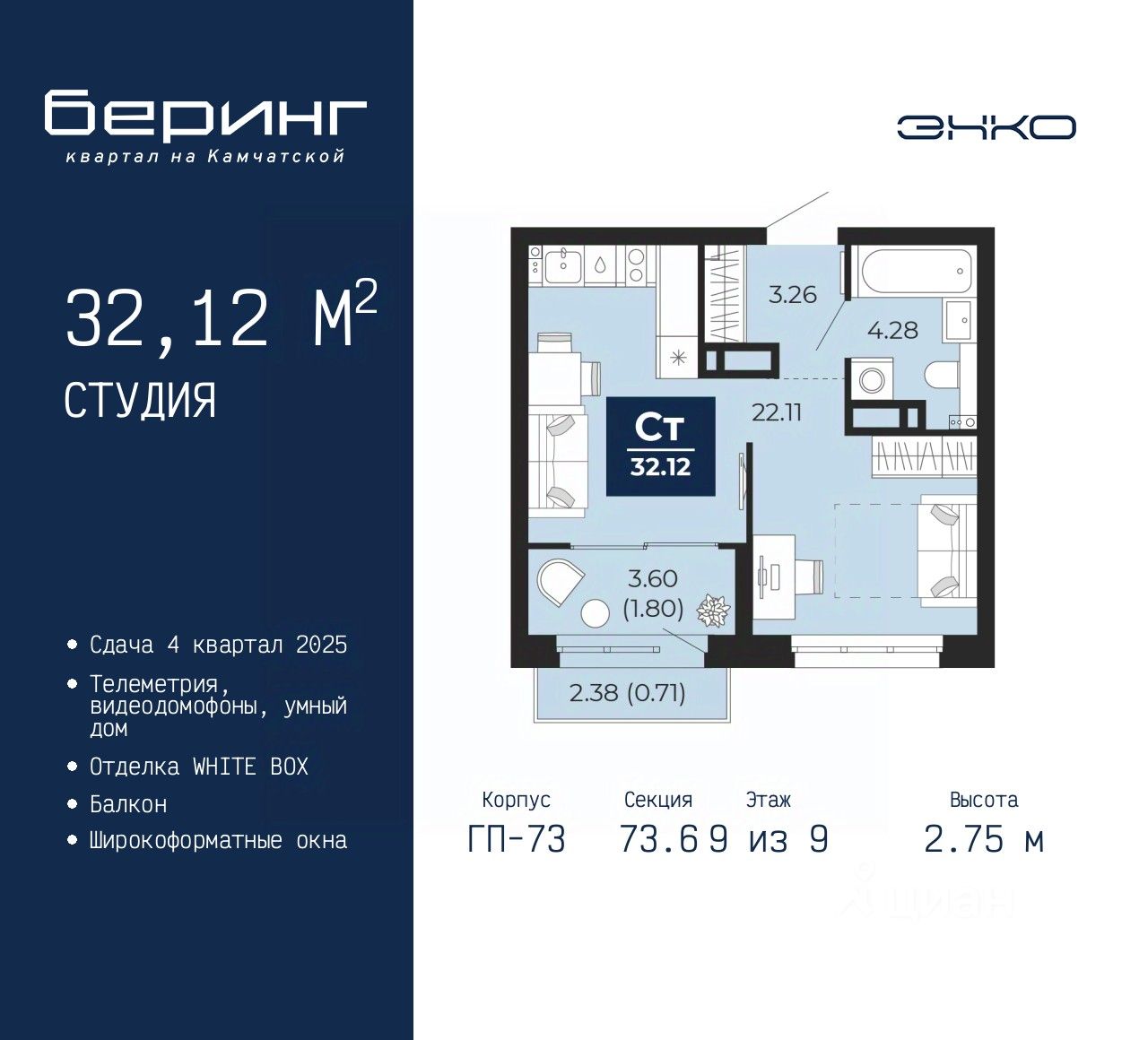 Однокомнатная квартира-студия в ЖК "Беринг" на 9 этаже. Квартира без отделки, новый собственник может сделать ремонт по своему дизайн-проекту. Общая площадь: 32.12 кв.м., площадь гостиной 22.11 кв.м., из которых 5 кв.м. выделено под кухонную зону. Все окна выходят на одну сторону. В квартире один балкон, один совмещенный санузел. Высота потолков 2.75 м.
