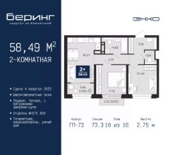 Продается двухкомнатная квартира в ЖК "Беринг" на 10 этаже. Квартира без отделки, после оформления собственности можно делать ремонт. Общая площадь: 58.49 кв.м., жилая: 21.58 кв.м., площадь просторной кухни-столовой: 16.21 кв.м. Комнаты изолированные, все окна выходят на одну сторону. В квартире один балкон и одна лоджия, один совмещенный и один раздельный санузел. Высота потолков 2.75 м.