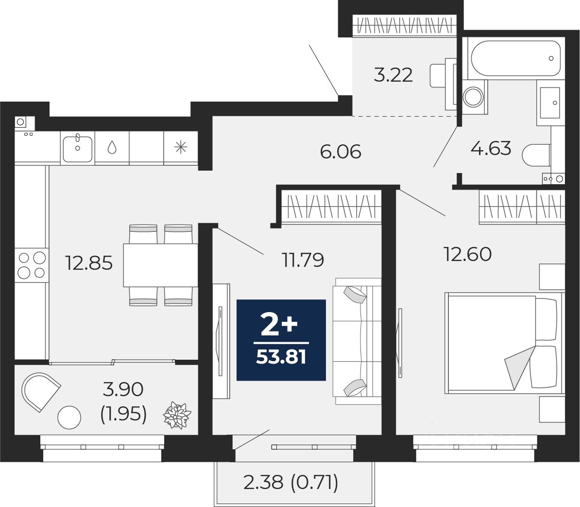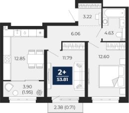 Просторная двухкомнатная квартира в ЖК "Беринг" на 9 этаже. Квартира без отделки, после выдачи ключей можно делать ремонт. Общая площадь: 53.81 кв.м., жилая: 24.39 кв.м., площадь просторной кухни-столовой: 12.85 кв.м. Комнаты изолированные, все окна выходят на одну сторону. В квартире одна лоджия, один совмещенный санузел. Высота потолков 2.75 м.