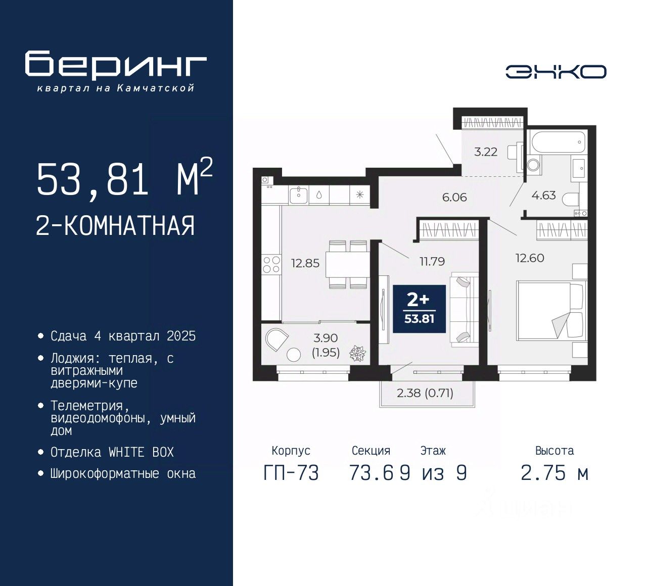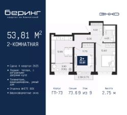 Просторная двухкомнатная квартира в ЖК "Беринг" на 9 этаже. Квартира без отделки, после оформления собственности можно делать ремонт. Общая площадь: 53.81 кв.м., жилая: 24.39 кв.м., площадь просторной кухни-столовой: 12.85 кв.м. Комнаты изолированные, все окна выходят на одну сторону. В квартире одна лоджия, один совмещенный санузел. Высота потолков 2.75 м.