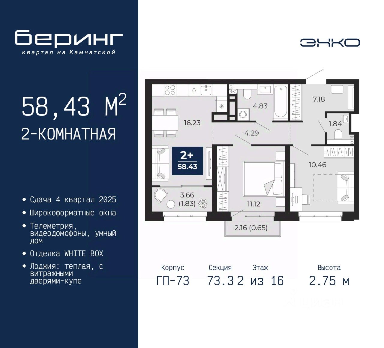 Двухкомнатная квартира от застройщика в ЖК "Беринг" на 2 этаже. Квартира без отделки, полностью готова к ремонту. Общая площадь: 58.43 кв.м., жилая: 21.58 кв.м., площадь просторной кухни-столовой: 16.21 кв.м. Комнаты изолированные, все окна выходят на одну сторону. В квартире один балкон и одна лоджия, один совмещенный и один раздельный санузел. Высота потолков 2.75 м.