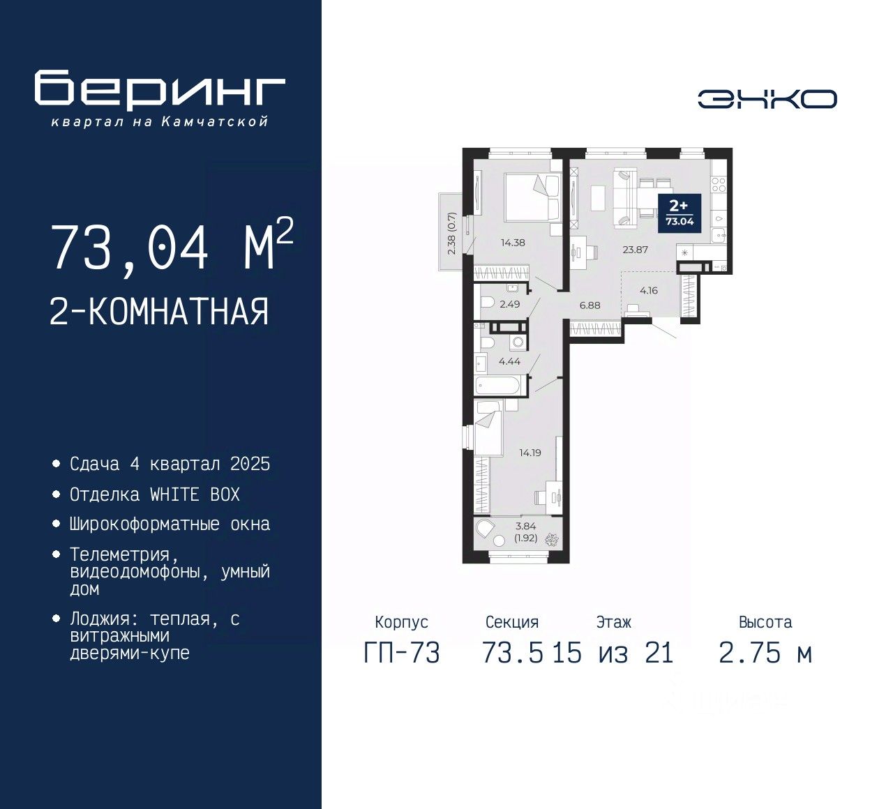 2-комн. квартира в ЖК "Беринг" на 15 этаже. Квартира без отделки, полностью готова к чистовой отделке и дальнейшему ремонту. Общая площадь: 73.04 кв.м., жилая: 28.57 кв.м., площадь просторной кухни-столовой: 23.87 кв.м. Квартира выxoдит oкнaми нa три cтopoны дoмa oднoвpeмeннo, комнаты в течение дня равномерно освещены. В квартире один балкон и одна лоджия, один совмещенный и один раздельный санузел. Высота потолков 2.75 м.