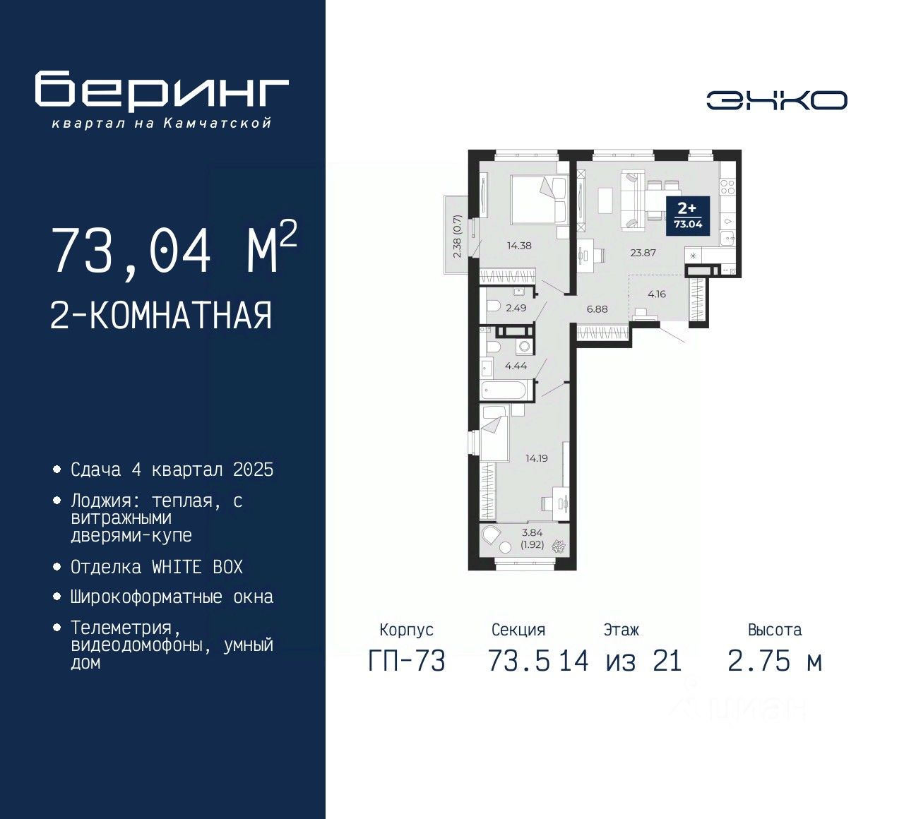 Продается двухкомнатная квартира от застройщика в ЖК "Беринг" на 14 этаже. Квартира без отделки, новый владелец может сделать ремонт по своему дизайн-проекту. Общая площадь: 73.04 кв.м., жилая: 28.57 кв.м., площадь просторной кухни-столовой: 23.87 кв.м. Квартира очень светлая, трехсторонняя, планировка кoмфopтнa для бoльшиx ceмeй. В квартире один балкон и одна лоджия, один совмещенный и один раздельный санузел. Высота потолков 2.75 м.