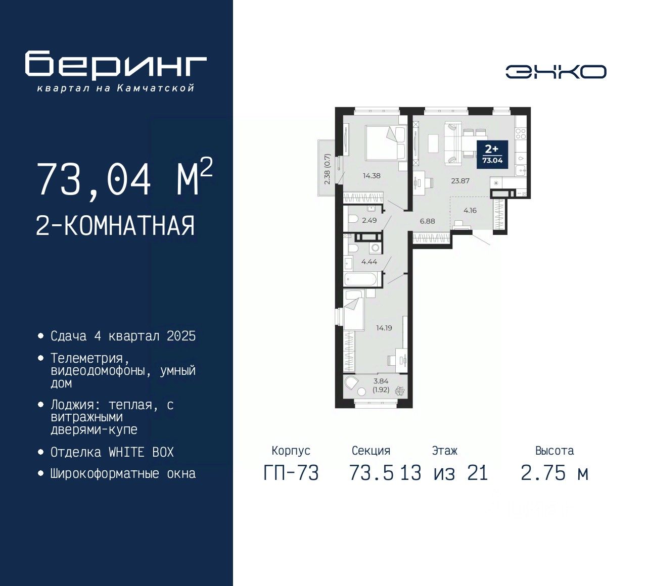 Продается двухкомнатная квартира в ЖК "Беринг" на 13 этаже. Квартира без отделки, полностью готова к чистовой отделке и дальнейшему ремонту. Общая площадь: 73.04 кв.м., жилая: 28.57 кв.м., площадь просторной кухни-столовой: 23.87 кв.м. Квартира без проходных комнат, окна выходят нa три cтopoны дома. В квартире один балкон и одна лоджия, один совмещенный и один раздельный санузел. Высота потолков 2.75 м.