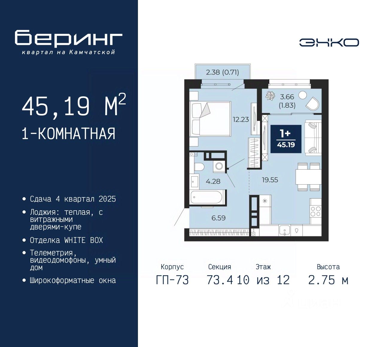 Просторная однокомнатная квартира в ЖК "Беринг" на 10 этаже. Квартира без отделки, полностью готова к ремонту. Общая площадь: 45.19 кв.м., жилая: 12.23 кв.м., площадь просторной кухни-столовой: 19.55 кв.м. Все окна выходят на одну сторону. В квартире один балкон и одна лоджия, один совмещенный санузел. Высота потолков 2.75 м.