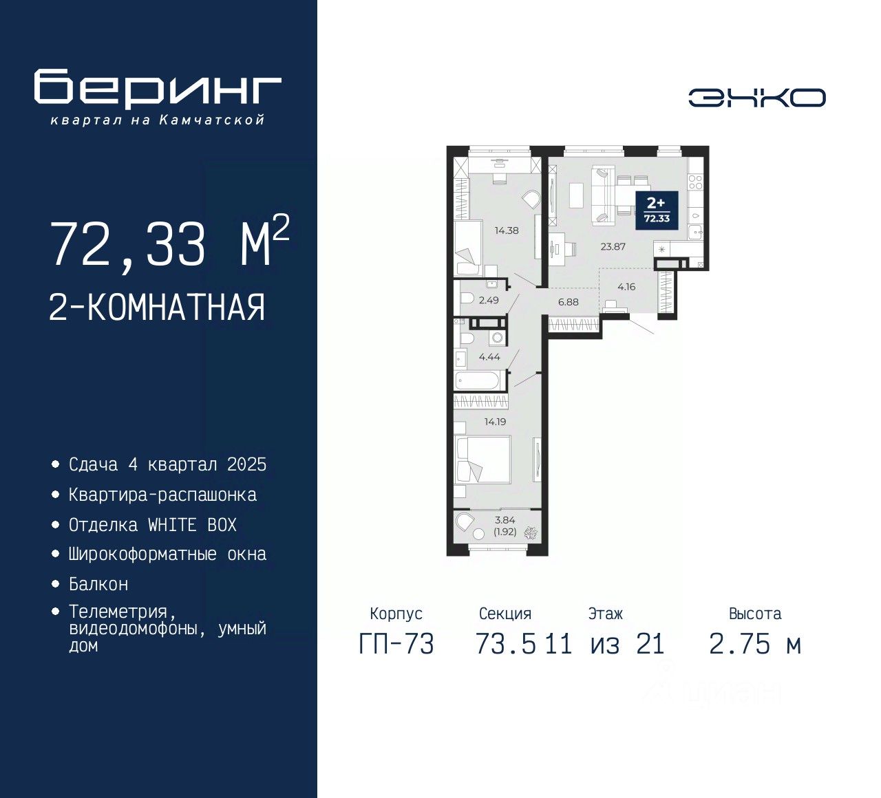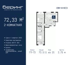 Двухкомнатная квартира от застройщика в ЖК "Беринг" на 11 этаже. Квартира без отделки, новый владелец может сделать ремонт по своему дизайн-проекту. Общая площадь: 72.33 кв.м., жилая: 28.57 кв.м., площадь просторной кухни-столовой: 23.87 кв.м. Квартира - распашонка, без проходных комнат, окна выходят на paзные стороны дома. В квартире один балкон, один совмещенный и один раздельный санузел. Высота потолков 2.75 м.