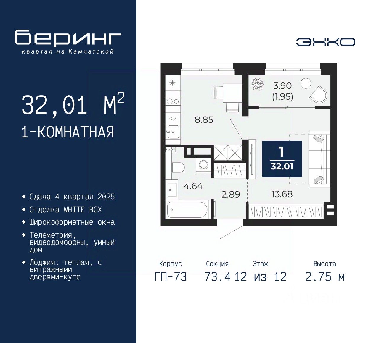 1-комн. квартира в ЖК "Беринг" на 12 этаже. Квартира без отделки, новый собственник может сделать ремонт по своему проекту. Общая площадь: 32.01 кв.м., жилая: 13.68 кв.м., площадь кухни: 8.85 кв.м. Все окна выходят на одну сторону. В квартире одна лоджия, один совмещенный санузел. Высота потолков 2.75 м.
