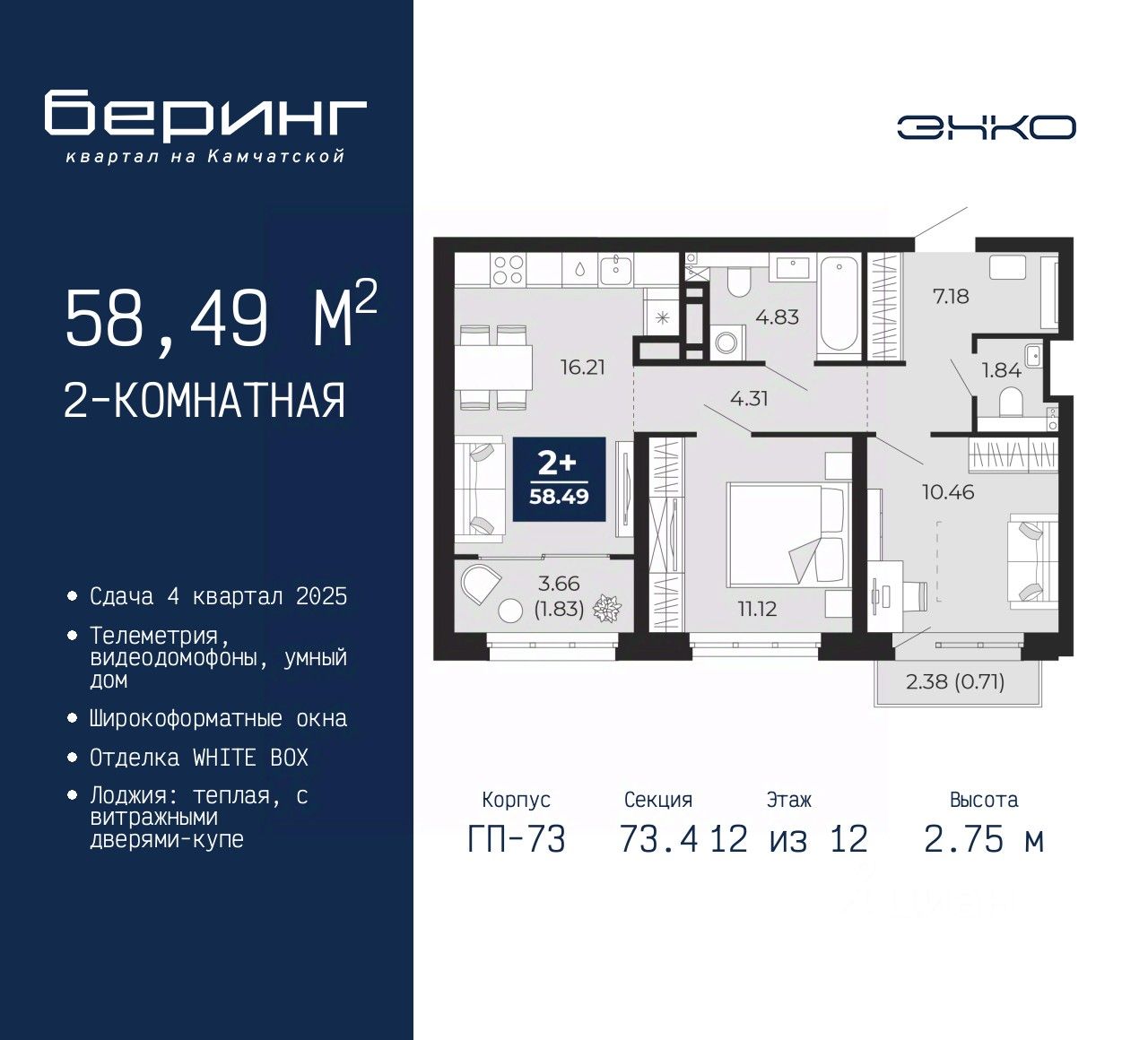 Двухкомнатная квартира в ЖК "Беринг" на 12 этаже. Квартира без отделки, после получения ключей можно делать ремонт. Общая площадь: 58.49 кв.м., жилая: 21.58 кв.м., площадь просторной кухни-столовой: 16.21 кв.м. Комнаты изолированные, все окна выходят на одну сторону. В квартире один балкон и одна лоджия, один совмещенный и один раздельный санузел. Высота потолков 2.75 м.