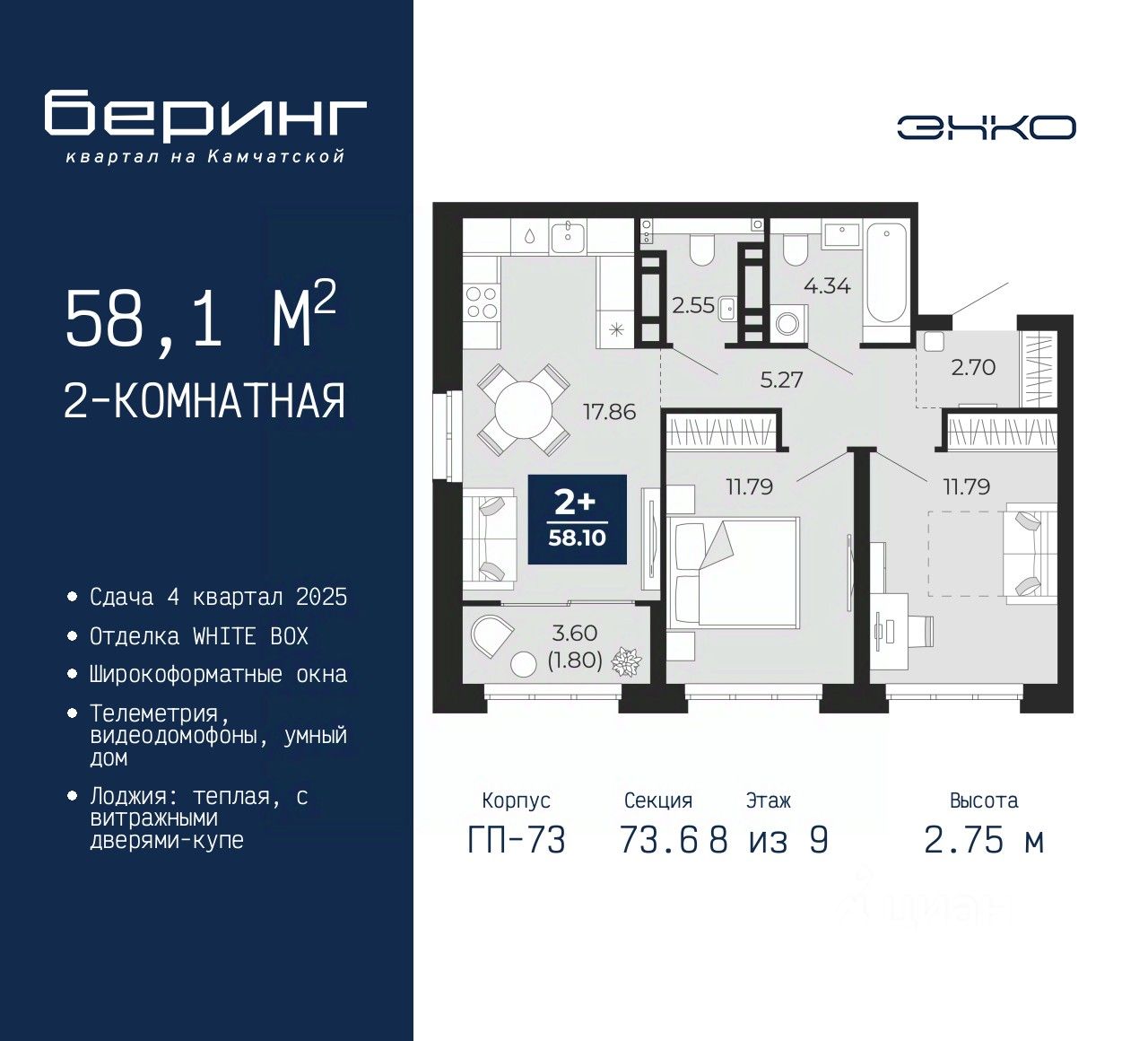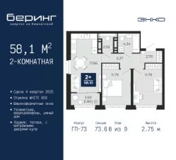 Просторная 2-комн. квартира в ЖК "Беринг" на 8 этаже. Квартира без отделки, после оформления собственности можно делать ремонт. Общая площадь: 58.1 кв.м., жилая: 23.58 кв.м., площадь просторной кухни-столовой: 17.86 кв.м. Квартира угловая, очень светлая, естественная вентиляция при открытии окон. В квартире одна лоджия, один совмещенный и один раздельный санузел. Высота потолков 2.75 м.