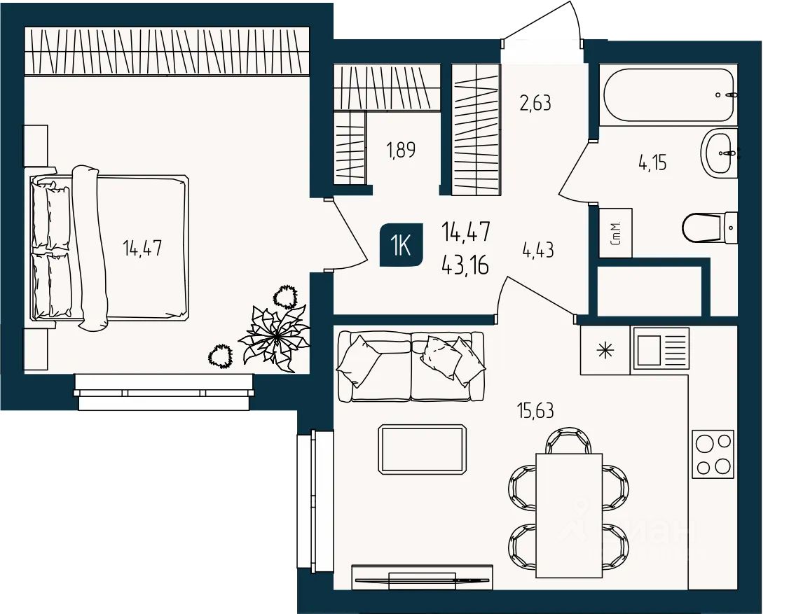 Продаётся 1-комнатная квартира в строящемся доме (Дом Каскад (ГП-2)), срок сдачи: III-кв. 2027, общей площадью 43.16 кв.м., на 8 этаже. Новый жилой комплекс "Квартал Мятный" от Специализированного застройщика "Юпитер" расположен по адресу: г. Тюмень по ул. Кулибина.