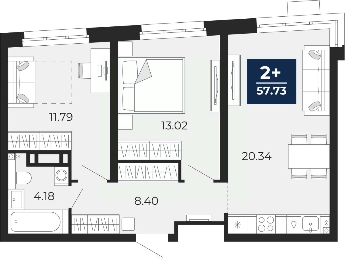 Двухкомнатная квартира от застройщика с предчистовой отделкой в ЖК "Прео" на 4 этаже. Общая площадь: 57.73 кв.м., жилая: 24.81 кв.м., площадь просторной кухни-столовой: 20.34 кв.м. Комнаты изолированные, все окна выходят на одну сторону. В квартире один совмещенный санузел. Высота потолков 2.7 м.