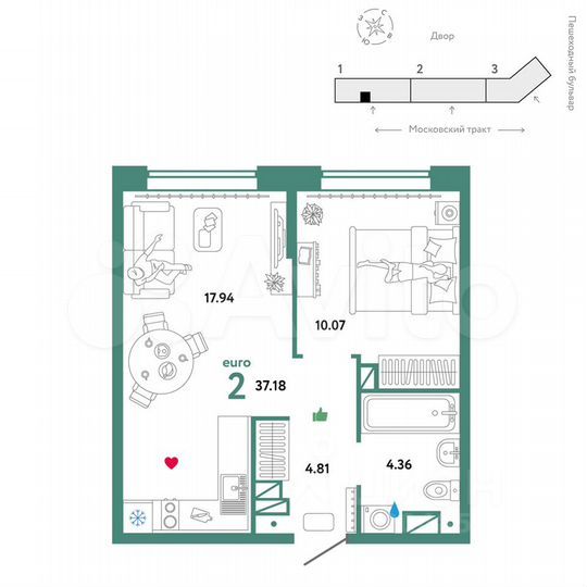 Продается уютная однокомнатная квартира в Тюмени по адресу: Первооткрывателей 2. Общая площадь квартиры — 37 кв. м, из которых просторная кухня занимает 18 кв. м. Квартира расположена на 9 этаже 17-этажного дома. Высота потолков — 2.6 метра, что добавляет ощущение простора.