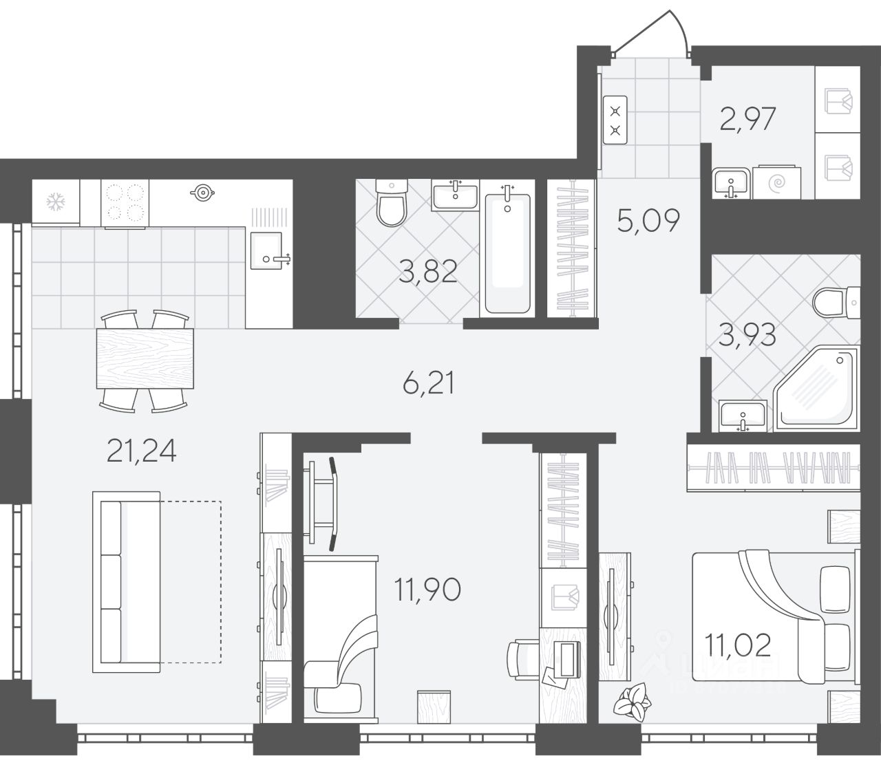 Продуманная геометрия комнат позволит легко зонировать пространство и подобрать необходимую мебель.