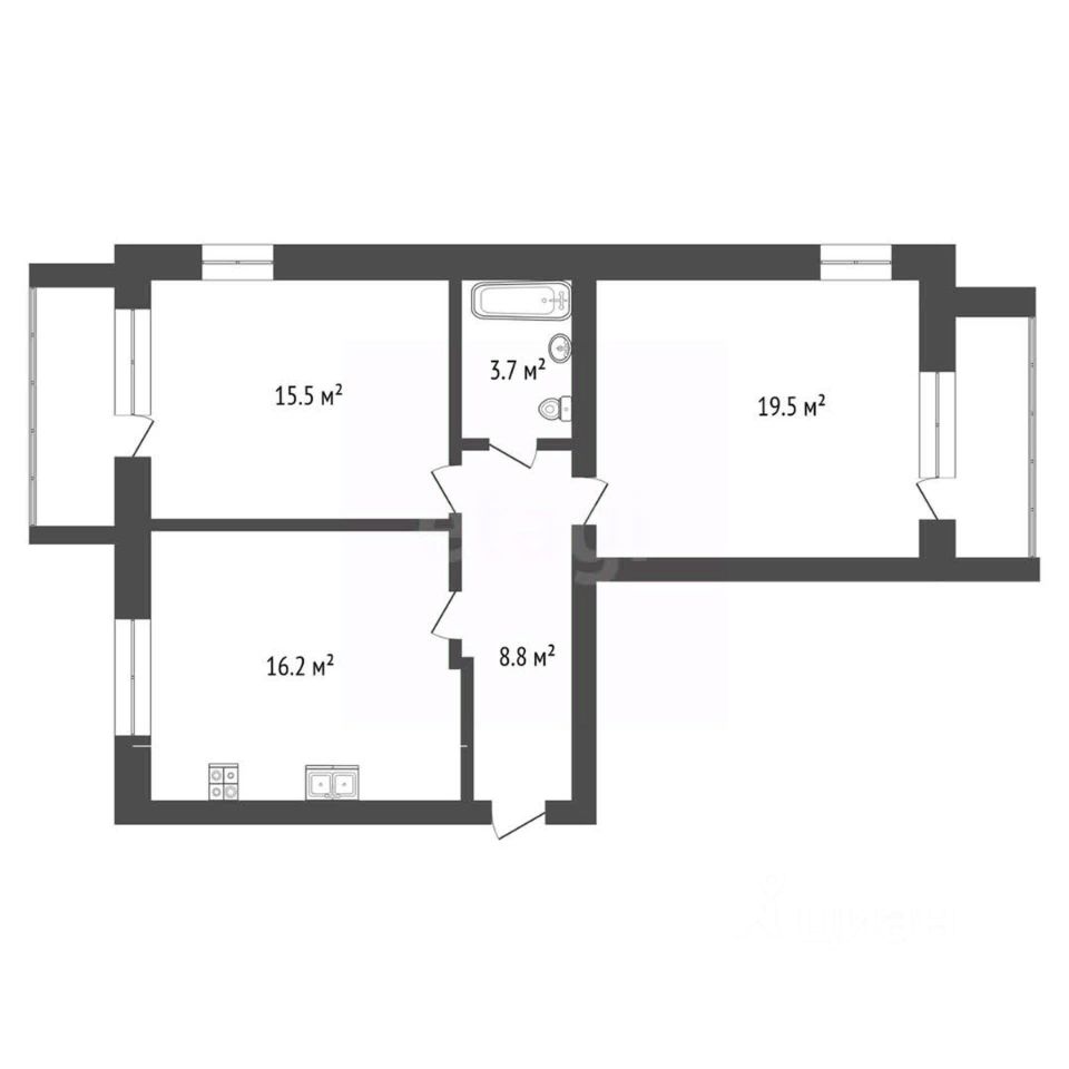 Удобная планировка - изолированные просторные комнаты правильной формы, окна которых выходят на две стороны дома (распашонка), есть 2 застекленные лоджии. Санузел совмещенный.