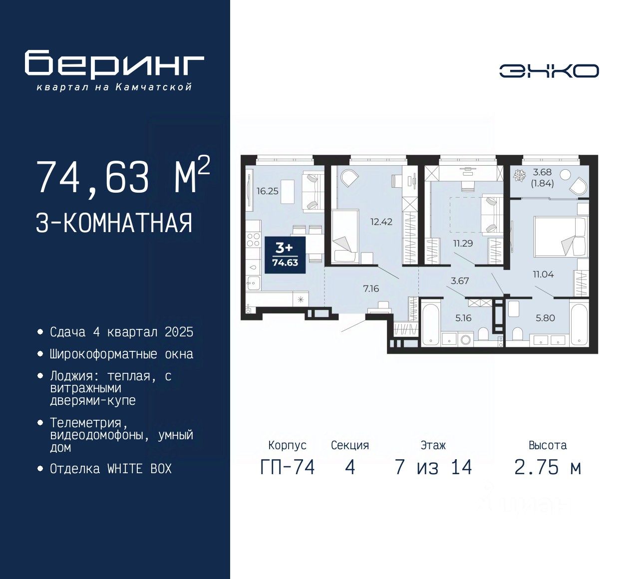 Продается 3-комн. квартира от застройщика в ЖК "Беринг" на 7 этаже. Квартира без отделки, полностью готова к чистовой отделке и дальнейшему ремонту. Общая площадь: 74.63 кв.м., жилая: 34.75 кв.м., площадь просторной кухни-столовой: 16.25 кв.м. Комнаты изолированные, все окна выходят на одну сторону. В квартире одна лоджия, два совмещенных санузла. Высота потолков 2.75 м.