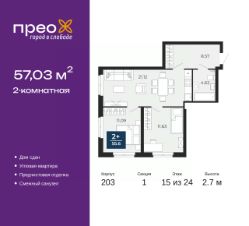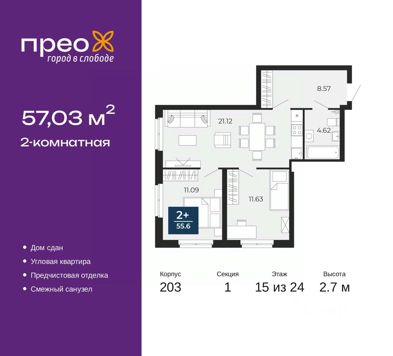 2-комн. квартира с предчистовой отделкой в ЖК "Прео" на 15 этаже. Общая площадь: 57.03 кв.м., жилая: 22.72 кв.м., площадь просторной кухни-столовой: 21.12 кв.м. Угловая квартира, идеально подойдет любителям тишины и панорамных видов. В квартире один совмещенный санузел. Высота потолков 2.7 м.