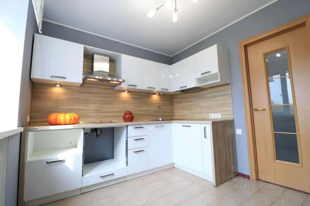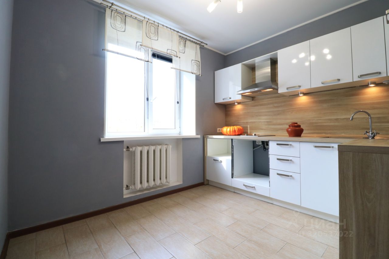 Просторная кухня правильной формы, гостиная 17, м² с окнами на две стороны и выходом на лоджию.