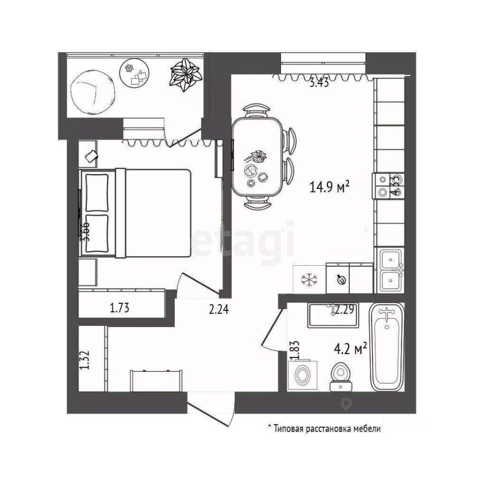 Функциональная планировка каждый метр с пользой. На планировке показан пример размещения мебели: просторная кухня-гостиная и уютная спальня, вместительный коридор, санузел и лоджия. Можно сразу приступать к отделке и создать интерьер под себя без переплаты за чужой вкус.