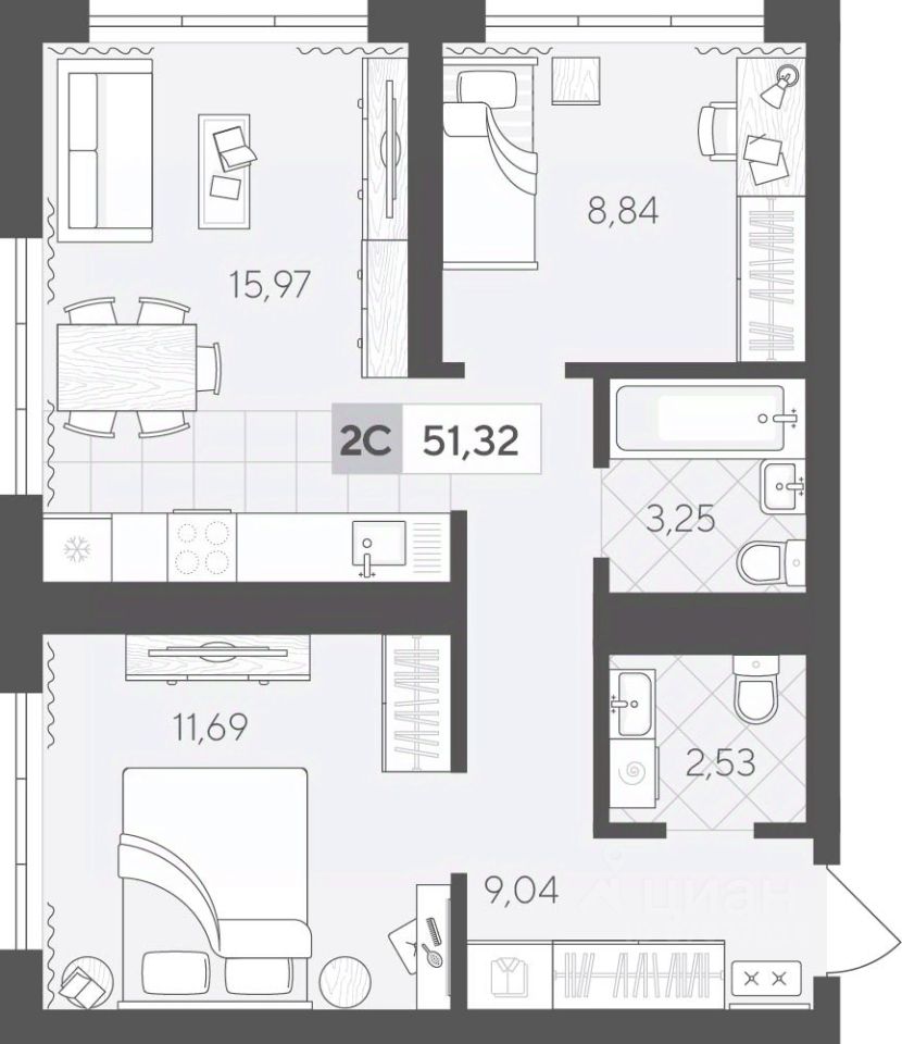 Продаётся 2-комнатная квартира в строящемся доме (ГП 2 (Сергея Корепанова, 34)), срок сдачи: IV-кв. 2027, общей площадью 51.32 кв.м., на 2 этаже. Новый жилой комплекс "Скандиа. Квартал у Леса" от Специализированного застройщика "СКАНДИА У ЛЕСА" расположен в г. Тюмень на ул. Бориса Прудаева.