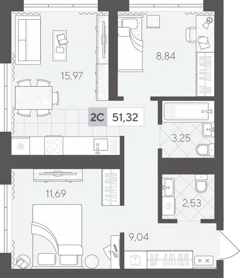 Продаётся 2-комнатная квартира в строящемся доме (ГП 2 (Сергея Корепанова, 34)), срок сдачи: IV-кв. 2027, общей площадью 51.32 кв.м., на 4 этаже. Новый жилой комплекс "Скандиа. Квартал у Леса" от Специализированного застройщика "СКАНДИА У ЛЕСА" расположен в г. Тюмень на ул. Бориса Прудаева.