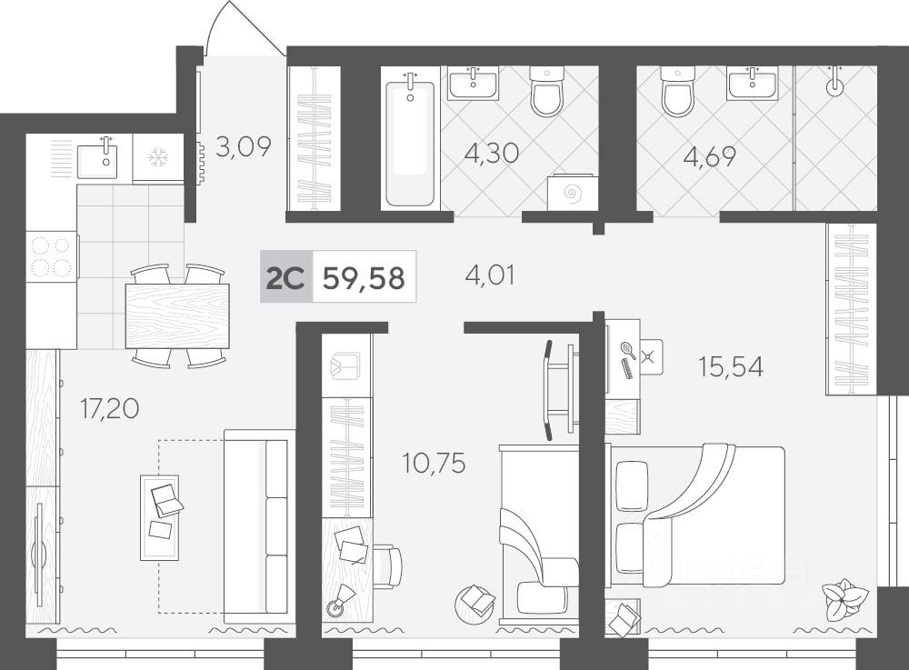 Продаётся 2-комнатная квартира в строящемся доме (ГП 2 (Сергея Корепанова, 34)), срок сдачи: IV-кв. 2027, общей площадью 59.58 кв.м., на 15 этаже. Новый жилой комплекс "Скандиа. Квартал у Леса" от Специализированного застройщика "СКАНДИА У ЛЕСА" расположен в г. Тюмень на ул. Бориса Прудаева.