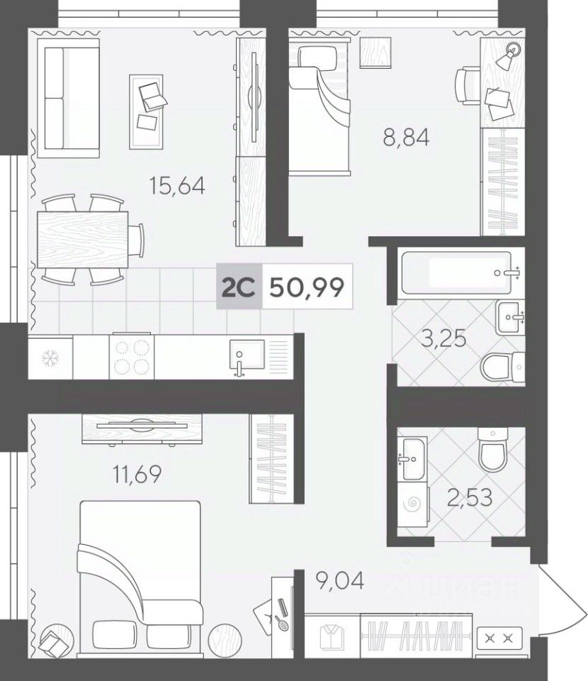 Продаётся 2-комнатная квартира в строящемся доме (ГП 2 (Сергея Корепанова, 34)), срок сдачи: IV-кв. 2027, общей площадью 50.99 кв.м., на 17 этаже. Новый жилой комплекс "Скандиа. Квартал у Леса" от Специализированного застройщика "СКАНДИА У ЛЕСА" расположен в г. Тюмень на ул. Бориса Прудаева.