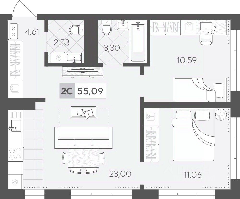 Продаётся 2-комнатная квартира в строящемся доме (ГП 2 (Сергея Корепанова, 34)), срок сдачи: IV-кв. 2027, общей площадью 55.09 кв.м., на 2 этаже. Новый жилой комплекс "Скандиа. Квартал у Леса" от Специализированного застройщика "СКАНДИА У ЛЕСА" расположен в г. Тюмень на ул. Бориса Прудаева.
