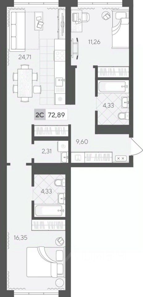 Продаётся 2-комнатная квартира в строящемся доме (ГП 2 (Сергея Корепанова, 34)), срок сдачи: IV-кв. 2027, общей площадью 72.89 кв.м., на 6 этаже. Новый жилой комплекс "Скандиа. Квартал у Леса" от Специализированного застройщика "СКАНДИА У ЛЕСА" расположен в г. Тюмень на ул. Бориса Прудаева.